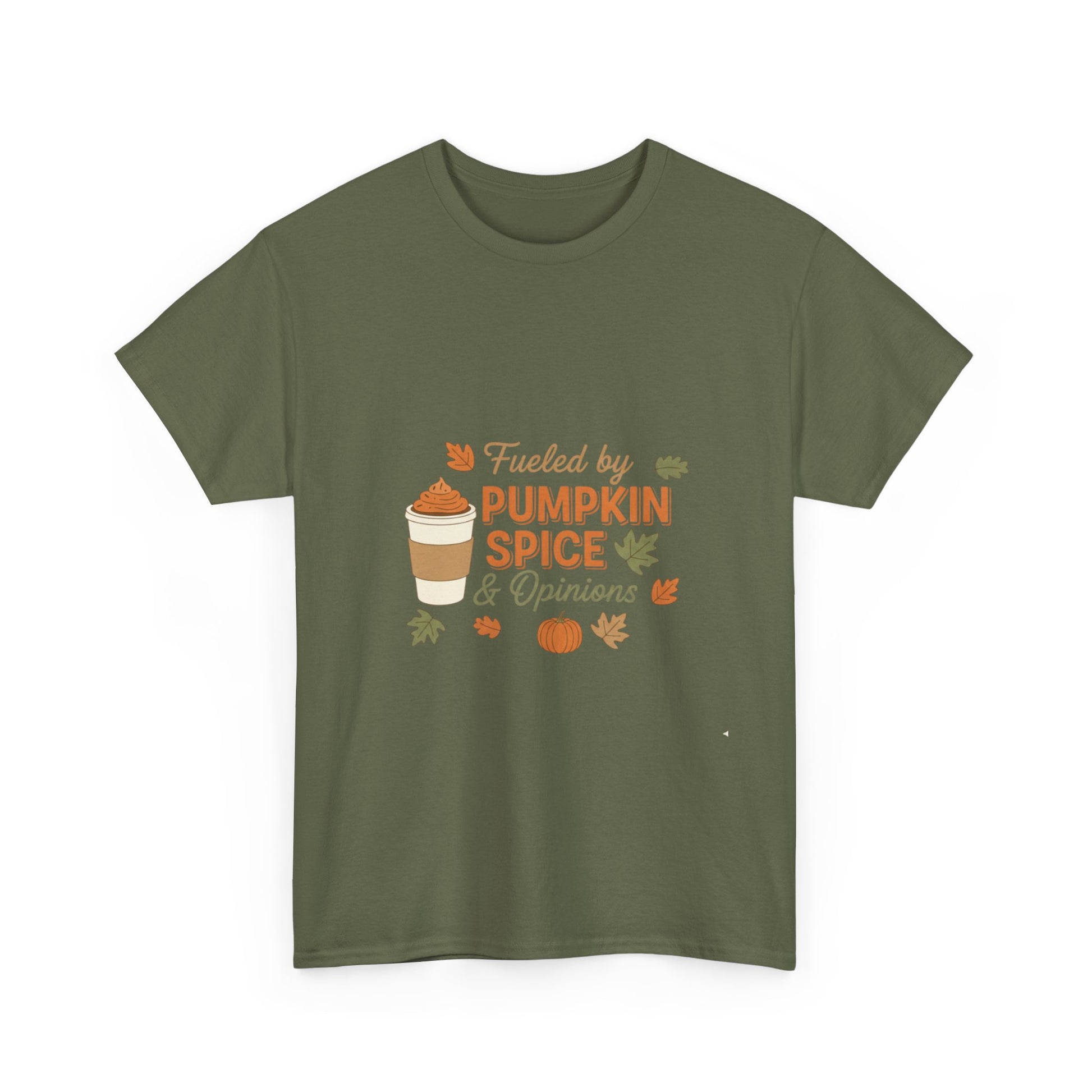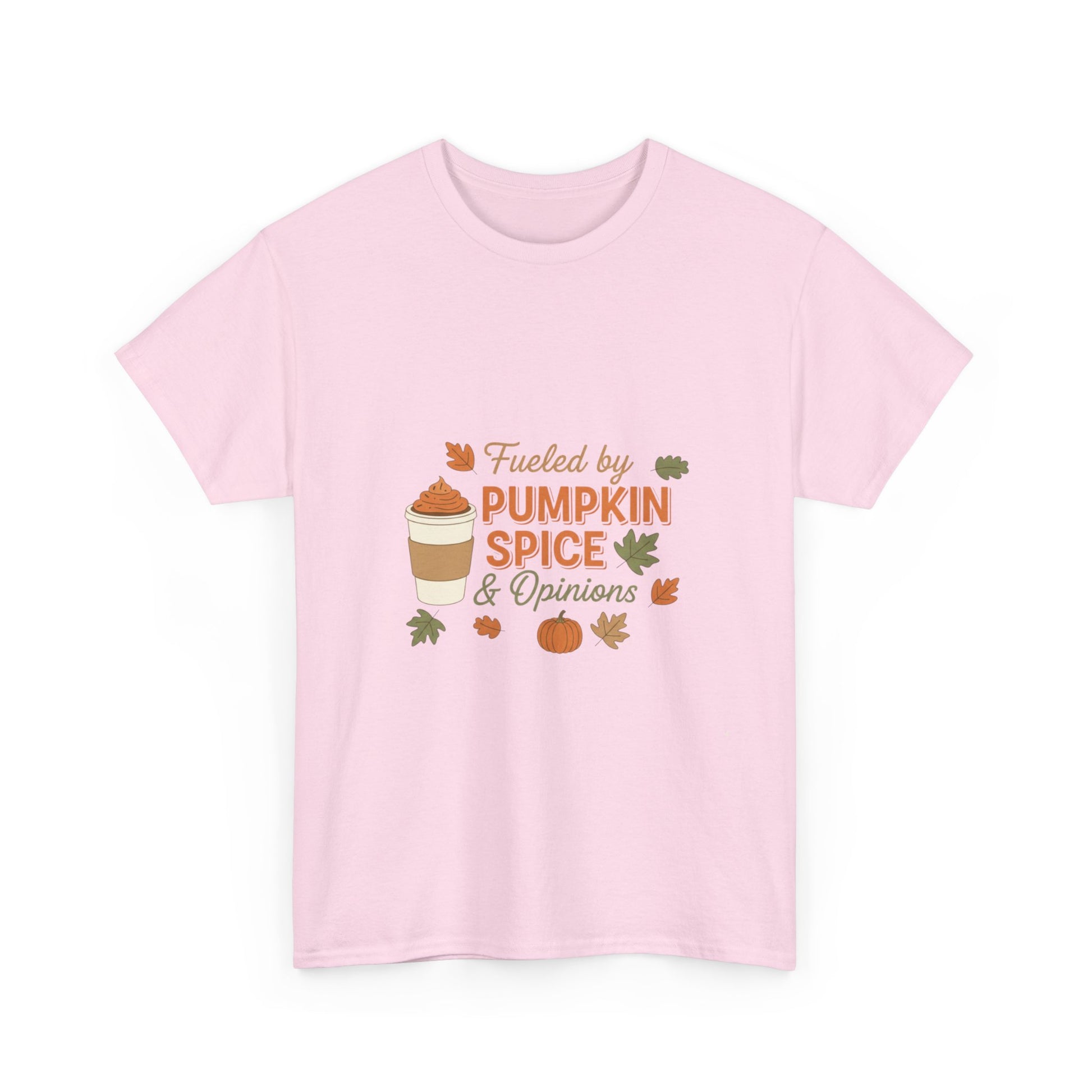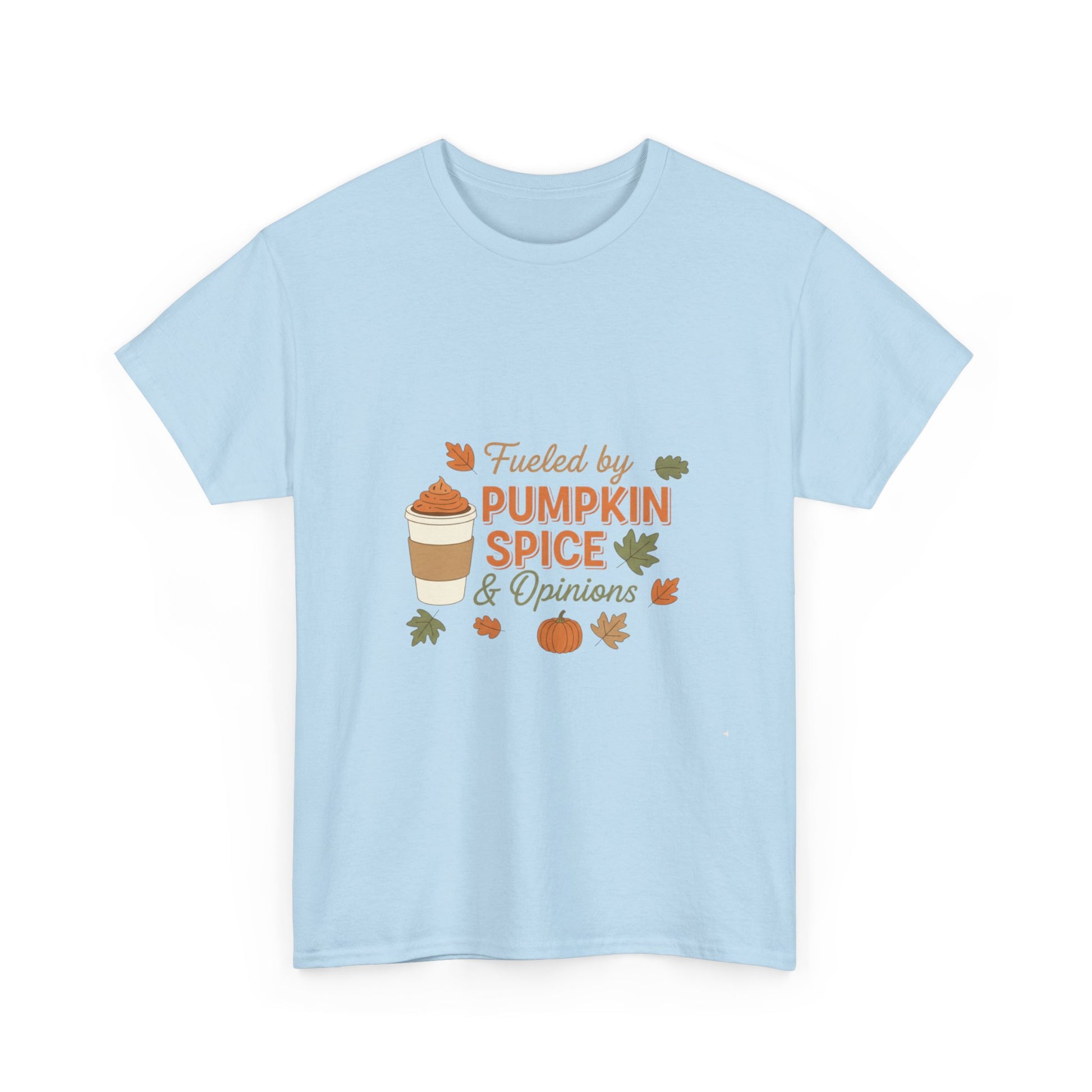 Introducing our Unisex Heavy Cotton Tee, the perfect blend of comfort and style for any casual occasion. Made with high-quality cotton, this tee is designed to keep you feeling cozy and looking good all day long. Featuring a fun "Fueled by Pumpkin Spice & Opinions" graphic, it captures the essence of autumn vibes and is ideal for those who love expressing their seasonal spirit. Great for fall gatherings, cozy coffee dates, or even just lounging at home, this shirt fits seamlessly into your everyday wardrobe. It's a fun gift for pumpkin spice lovers, making it perfect for Halloween, Thanksgiving, or just celebrating the cozy season with friends!