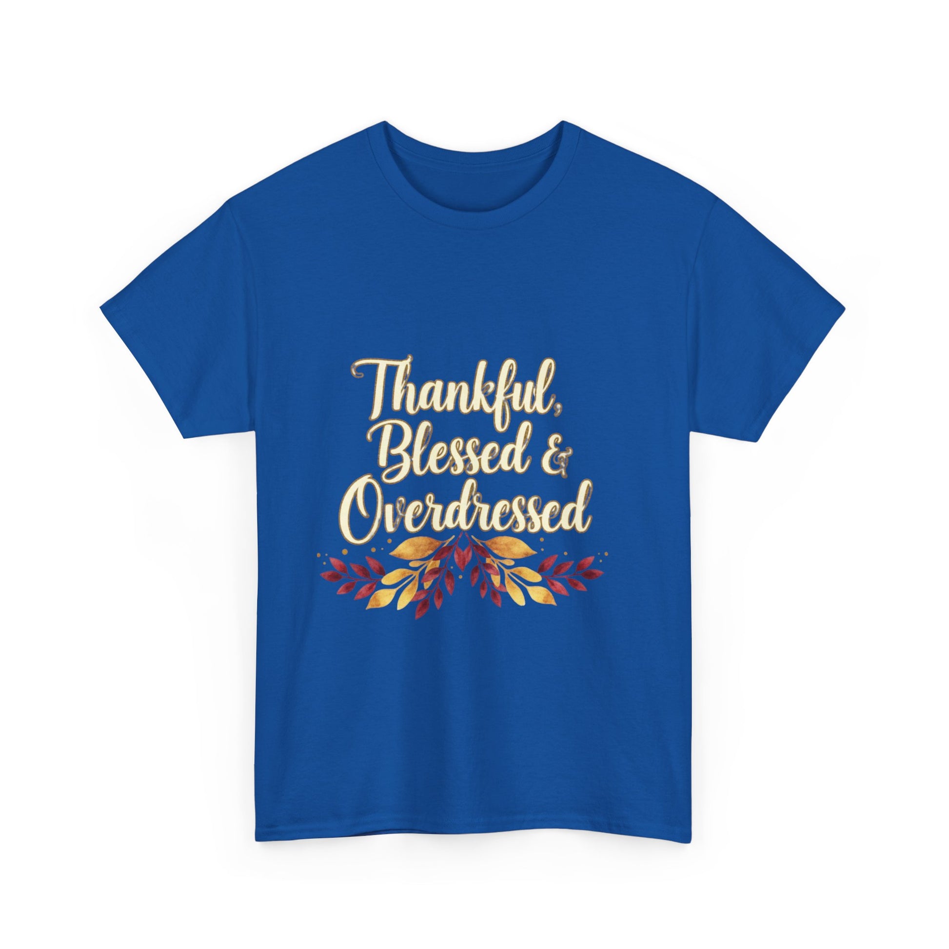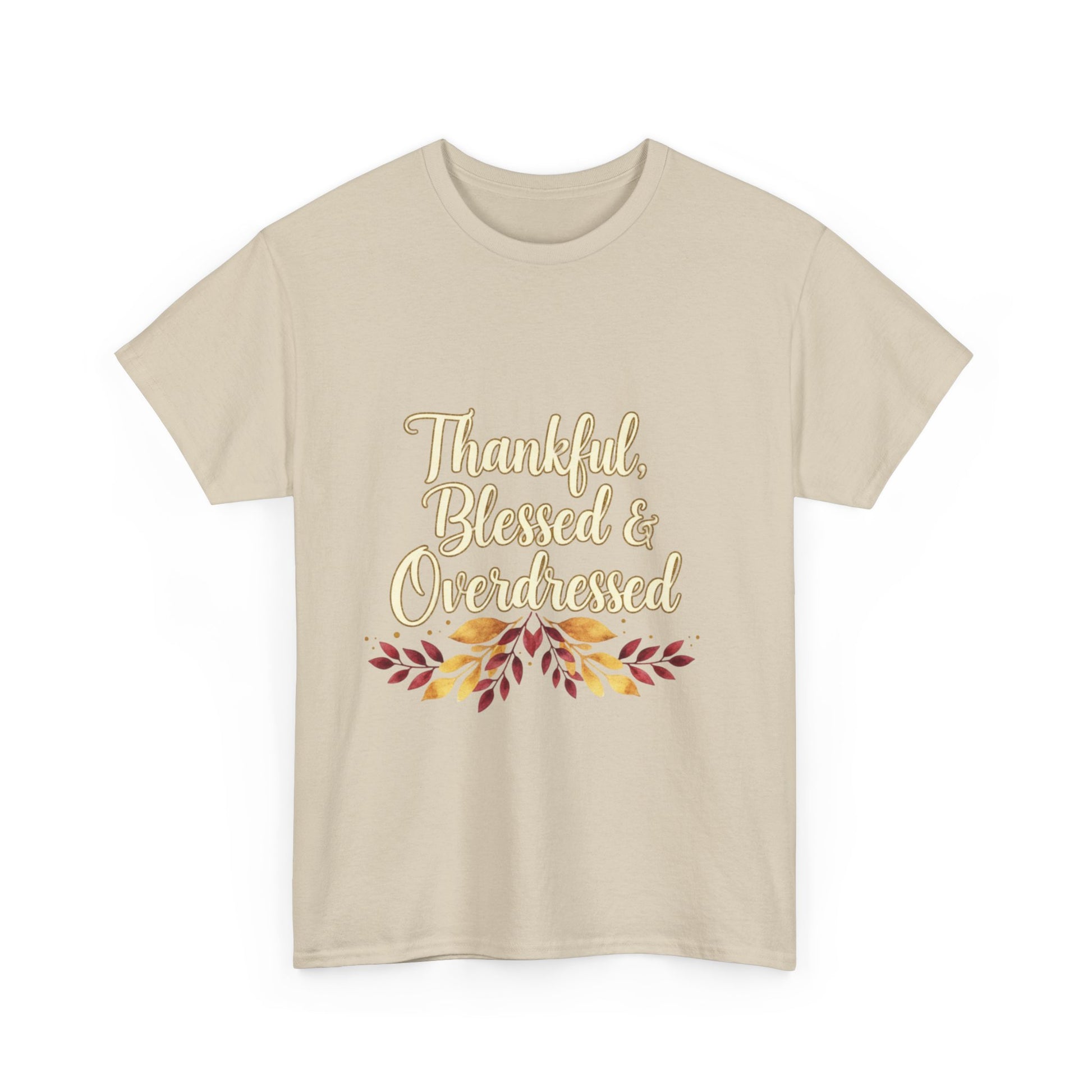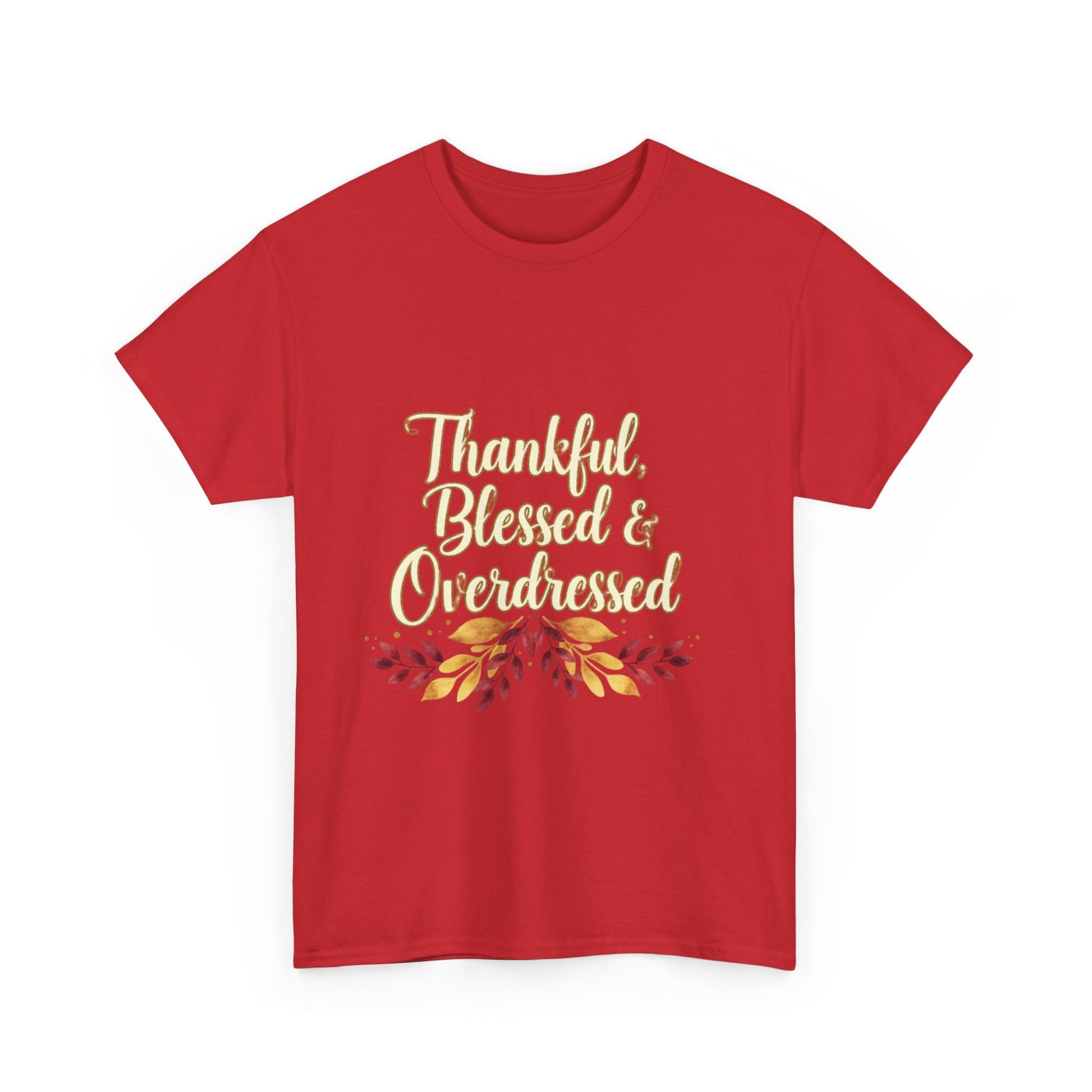 Embrace a cozy vibe with this Unisex Heavy Cotton Tee, perfect for adding a touch of thanks to your autumn wardrobe. Featuring a delightful "Thankful, Blessed & Overdressed" graphic, this shirt is ideal for family gatherings, Thanksgiving celebrations, or just casual outings with friends. It resonates with anyone looking to express gratitude and enjoy the festive season in style. The tee's relaxed fit and timeless crew neckline make it a versatile choice, easily paired with jeans or shorts. Whether lounging at home or attending seasonal festivities, this tee will keep you comfortable and stylish all day long. Perfect for those who cherish family moments, this shirt makes an excellent gift for friends during the holidays, or a cozy treat for yourself!